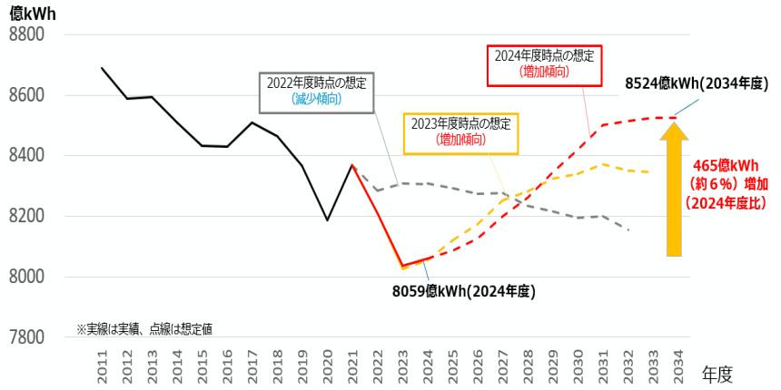 DX(デジタルトランスフォーメーション)やGXなどの進展にともなってデータセンターや半導体工場の新増設などが見込まれます。こうした新たな経済活動によって、日本の電力需要は省エネを見込んでも、なお増加に転じると見込まれており、必要となる脱炭素電源の供給が確保されるように万全の備えをおこなうことが重要です。