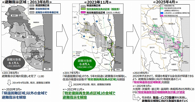 「帰還困難区域」(将来にわたって居住を制限するとされてきた区域)の避難指示解除に向けた取り組みも進んでいます。帰還を希望する全住民の帰還に向けた取り組みを進めていくため、2023年に創設された「特定帰還居住区域制度」に基づき、2025年3月までに大熊町・双葉町・浪江町・富岡町・南相馬市の復興再生計画が認定されました。また、2025年3月には、飯舘村の堆肥製造施設およびその周辺の農地と、葛尾村の風力発電事業用地について、居住を前提としない土地活用に向けた避難指示解除をおこないました。