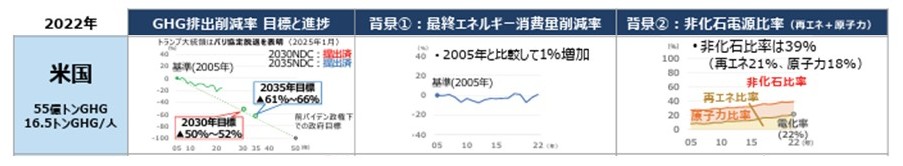 前バイデン政権は2050年カーボンニュートラルを宣言し、2035年に2005年比で61~66%のGHG排出削減目標を掲げ、省エネの促進、再エネや原子力のさらなる導入拡大、電化やネガティブエミッションなどの取り組みに向けた各種政策を実施してきました。