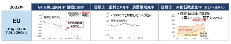 2050年カーボンニュートラルに向けて、2030年には1990年比で少なくともGHG排出を55%削減する目標を掲げています。目標の実現に向けて、EUはエネルギーの脱ロシア依存を加速化しつつ、米国や中国などに対抗するため、欧州域内におけるグリーン産業支援を強化しています。2030年NDC(自国の温室効果ガスの排出削減目標)の更新版において、最終エネルギー消費量削減目標をこれまでの「EUリファレンスシナリオ(現行政策を前提としたエネルギー、温室効果ガス排出などの動向を示す基準シナリオ)2020」からさらに11.7%の削減を目標に掲げるなど省エネを進めるとともに、最終エネルギー消費における再エネの割合を2030年までに少なくとも42.5%とする目標も掲げています。