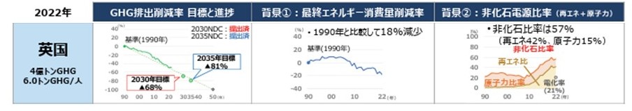 2050年カーボンニュートラルに向けて、2035年に1990年比でGHG排出を少なくとも81%削減する目標を掲げています。2030年の最終エネルギー消費量15%削減(2021年比)を目標に、省エネ技術開発の促進、住宅・建築物における低炭素暖房システムの導入、EVの導入などの省エネを推進。また、「エネルギー安全保障戦略」(2022年)に基づいて、再エネの拡大と原子力の活用による電源の非化石化を進めています。
