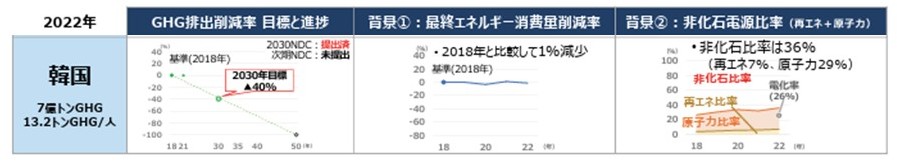 ※韓国は、UNFCCCに提出しているGHG排出量の最新データが2021年のため、GHG排出削減率は2021年までを記載。2021年以前は、GHG排出量をUNFCCCに提出している年のみ記載