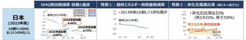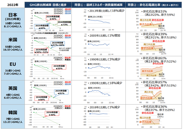 前編では、日本を含めた主要5か国・地域(日本・米国・EU・英国・韓国)について、それぞれのGHG排出削減率の目標と進捗、その背景にある「最終エネルギー消費量」(最終的に消費者が使うすべてのエネルギー量から発電や輸送中のロスなどを差し引いたもの)の削減率、「非化石電源比率」(発電に占める再生可能エネルギー〔再エネ〕と原子力の比率の合計)をグラフで見ていきましょう。