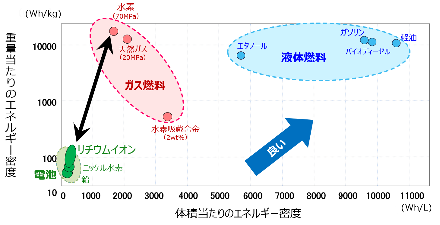 いま、乗用車は電動化や水素化が進んでいますが、動力源を電気・水素エネルギーに転換させることがむずかしいモビリティや製品もあります。それは、現在使用されているガソリンなどの液体燃料と電気・水素エネルギーでは、エネルギー密度に大きな差があるためです。