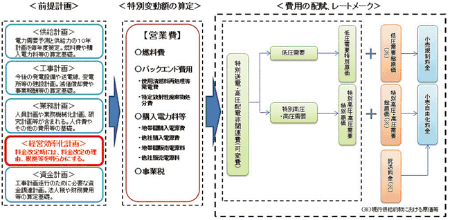 「前提計画」(需給や効率化計画等)をチェックした上で、社会的経済事情の変動による電源構成の変化があった場合、一般電気事業供給約款料金算定規則に基づき、燃料費、バックエンド関係費用、購入・販売電力料、事業税の変動額から算定される特別変動額を、低圧需要と特別高圧・高圧需要の費用に配分し、原価算定期間の残存期間における低圧需要の変動原価(当初認可時の3年平均原価を上回る部分)と変動収入が一致するように小売規制料金を設定(レートメーク)する。