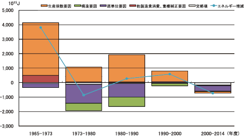 - 生産指数要因は生産指数の変化による要因で、生産指数の増加がエネルギー消費の増加要因となる。構造要因は産業構造の変化による要因で、エネルギー多消費型産業に移る場合はエネルギー消費の増加要因、素材産業から加工組立型産業に移る場合はエネルギー消費の減少要因となる。原単位要因は生産量の単位当たりのエネルギー消費量の変化による要因であり、省エネルギーが進めばエネルギー消費の減少要因となる。