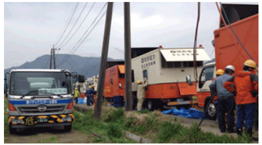 そのほか、熊本地震においては、医療機関、福祉施設、避難所等の早期に通電を復旧させるべき施設等に対し、電源車による臨時の電力供給を行う対応が実施されました。また、送電鉄塔が傾斜したこと等により停電が長期化した阿蘇地域に対し、九州電力が全国の電力会社から応援を受け多くの電源車を配備し、24時間体制での送電を実施しました。この電源車に対して、発電用燃料を継続的に給油する必要があったため、九州電力、地元のSS事業者や経済産業省、全国石油商業組合連合会、石油連盟、ドラム缶工業会等が協力し、電源車を配備した地点への大量のドラム缶配備、周辺地域から集めたミニローリーによるSS・小口配送拠点とのピストン運送等、円滑な供給に必要な体制を業界の垣根を越えて急遽調整し構築しました。ガスについても同様に、供給停止した地域において、西部ガスや日本ガス協会が、移動式ガス発生設備による医療機関等への臨時供給などの応急対策を実施しました。