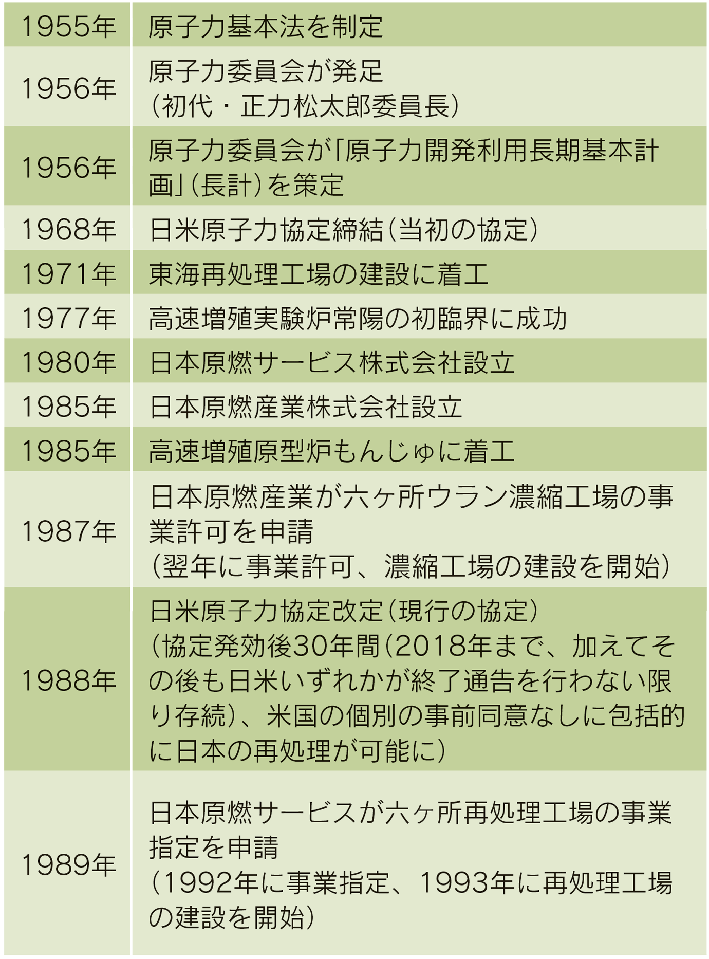 1968年締結の日米原子力協定では米国の個別の同意なしには再処理を行えない規定となっていましたが、1988年に、協定発効後30年間(2018年まで、加えてその後も日米いずれかが終了通告を行わない限り存続)、米国の個別の事前同意なしに包括的に日本の再処理を可能とする現行日米原子力協定が成立しました。