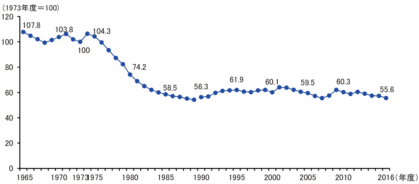 - 原単位は製造業IIP(付加価値ウェイト)1単位当たりの最終エネルギー消費量で、1973年度を100とした場合の指数である。