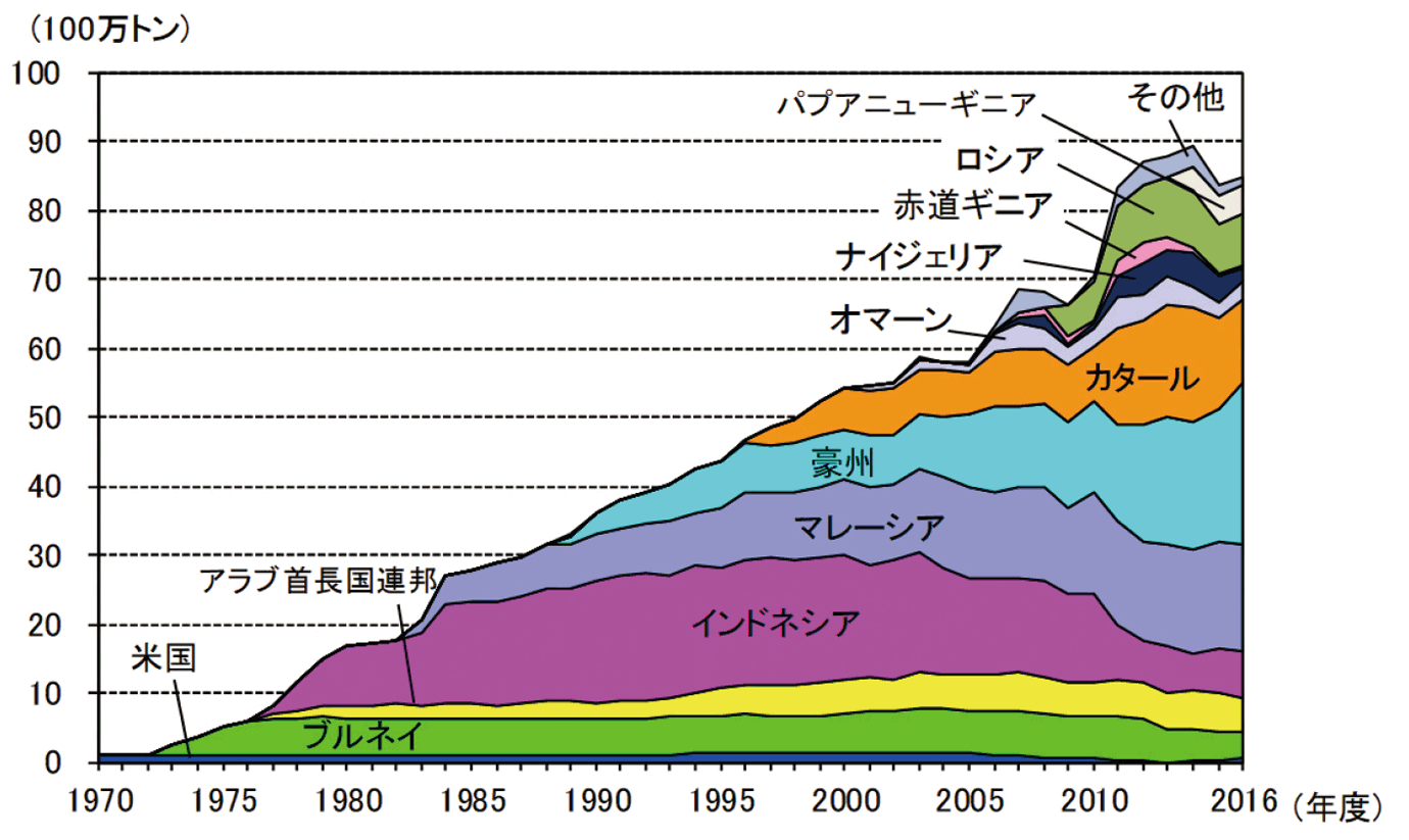 我が国に対するLNGの輸入先は、2016年度において、豪州、マレーシア、ロシアなどのアジア大洋州地域を始めとする中東以外の地域が77.2%を占めており、中東依存度は22.8%と石油と比べて低く、地政学的リスクも相対的に低いといえます。特に、2012年度から最大のLNG輸入先となっている豪州は、新規LNG基地からの輸入が順次開始されており、その割合は2012年度の19.6%から2016年度には27.7%に拡大しています(第213-1-10、第213-1-11)。また、2014年度にはパプアニューギニアから、2017年1月には米国からのシェールガスを原料にしたLNG輸入が開始されるなど、供給先の多角化がさらに前進しています。なお、2016年において、世界のLNG貿易の31.3%を日本の輸入が占めました(第2章 国際エネルギー動向 第222-1-23「世界のLNG輸入」参照)。