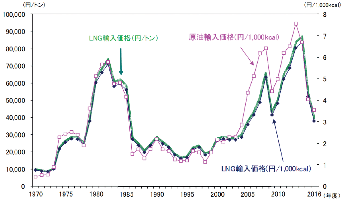 2011~2013年度の間は、原油輸入CIF価格が3年連続で年平均1バレル当たり100ドル超の水準が続き、円建てLNG輸入価格も2014年度に過去最高を更新し1トン当たり約8.7万円となりました。2014年度の下期以降、国際原油価格の下落に伴い、円建てLNG輸入価格は低下し、2015年度は1トン当たり約5.4万円、2016年度は約3.9万円となりました。2016年度の円建てLNG輸入価格は過去最高であった2014年度の半分以下の水準となりました。
