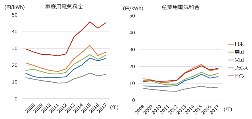 他方、これによる国民負担増が課題となっています。ドイツは製造業比率(GDPに占める製造業の割合)が主要国で最も高く、エネルギー多消費産業に対する配慮としてFITによる再生可能エネルギー負担金の減免などの措置を講じる一方、家庭用の電気料金は、この5年間で約36円/kWhから約41円/kWhに上昇しています。需要家の負担抑制のため、買取価格を引き下げるとともに、2017年から入札制度を導入(対象は一部の太陽光発電、風力発電、バイオマス発電)しています。