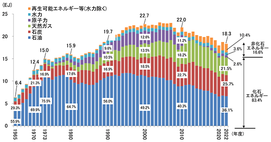 - 1989年度以前のデータはIEA「World Energy Balances 2023 Edition」、1990年度以降のデータは資源エネルギー庁「総合エネルギー統計」を基に作成