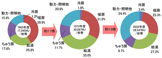 家庭部門のエネルギー消費は、冷房、暖房、給湯、ちゅう房、動力・照明他の5つの用途に分類できます。2022年度における用途別のシェアを1965年度や1973年度のシェアと比べると、特に動力・照明他の割合が大きくなっていることがわかります(第212-2-5)。