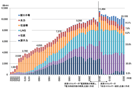(注1)2009年度以前のデータは旧一般電気事業者10社による発電が対象。ただし、1971年度以前のデータには沖縄電力が含まれていない。