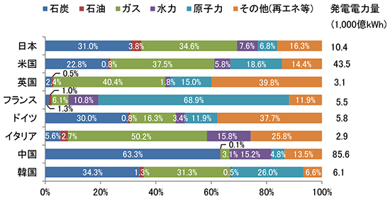 【第223-1-7】主要国の発電電力量と発電電力量に占める各電源の割合(2021年)