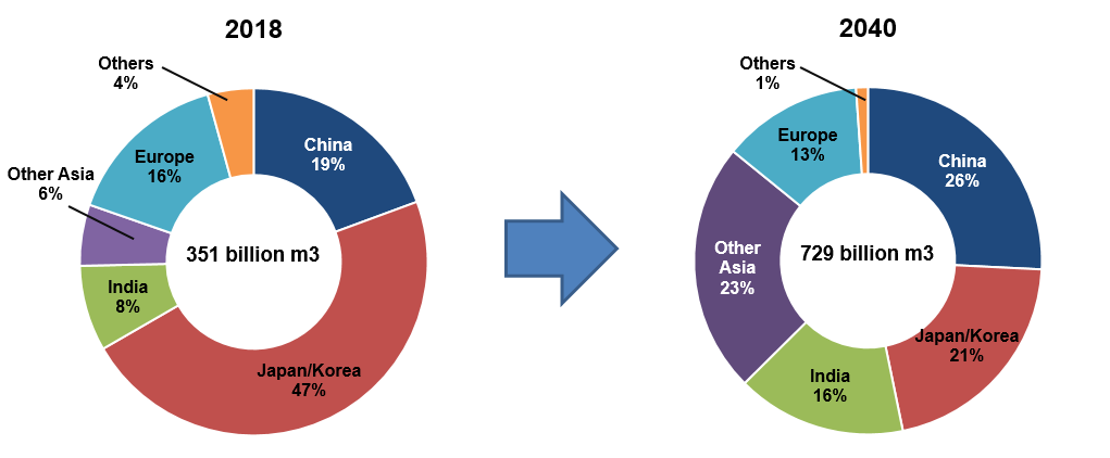 Global LNG demand is expected to double by 2040 with the emergence of fast-growing LNG importers. In 2018, Japan and Korea accounted for 47% of net imports. In 2040, China, India and other Asian nations will contribute to market growth with the ratio of Japan decreasing substantially.