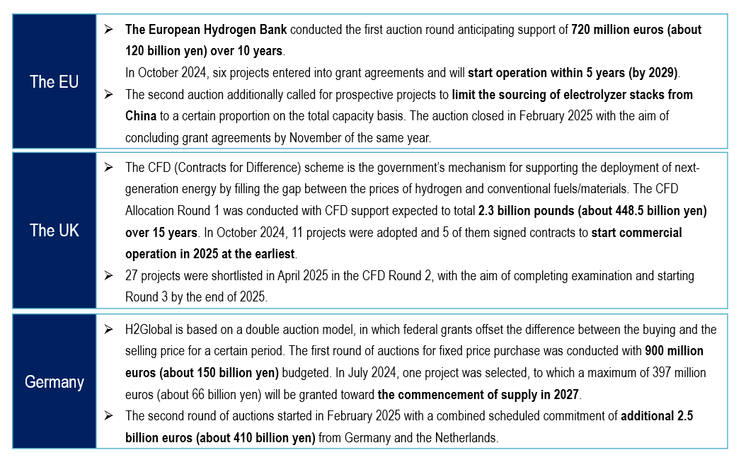 In the EU, for example, the European Hydrogen Bank was launched to unlock private investments in green hydrogen production and promote its popularization. Furthermore, government support measures are being taken steadily in the UK and Germany. In the USA, tax credits are offered by the Inflation Reduction Act.