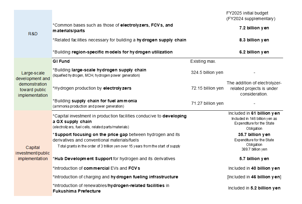 The 7th Strategic Energy Plan stipulates that strong support will be given to the development of a large-scale supply chain for hydrogen and its derivatives based on the Hydrogen Society Promotion Act. It also states that reducing costs and expanding utilization will be promoted in tandem by integrated regulatory and support measures, taking into account trends in other countries and private companies.